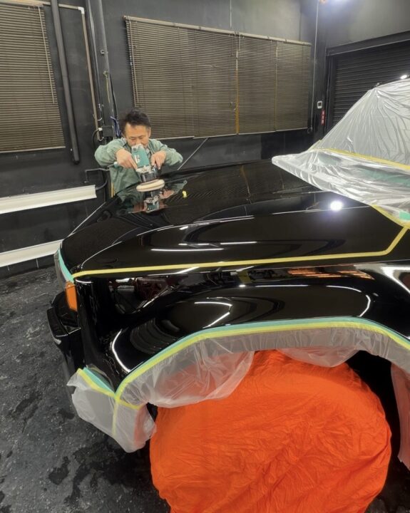 磨き終わったあとは再度洗車を丁寧に行い、傷がつかないように拭き上げていきます。お店の施工レベルの差が出やすい部分です。 当店では専用設備も用いて徹底した下地処理に力を入れています。